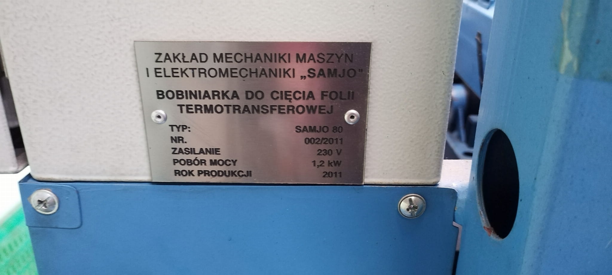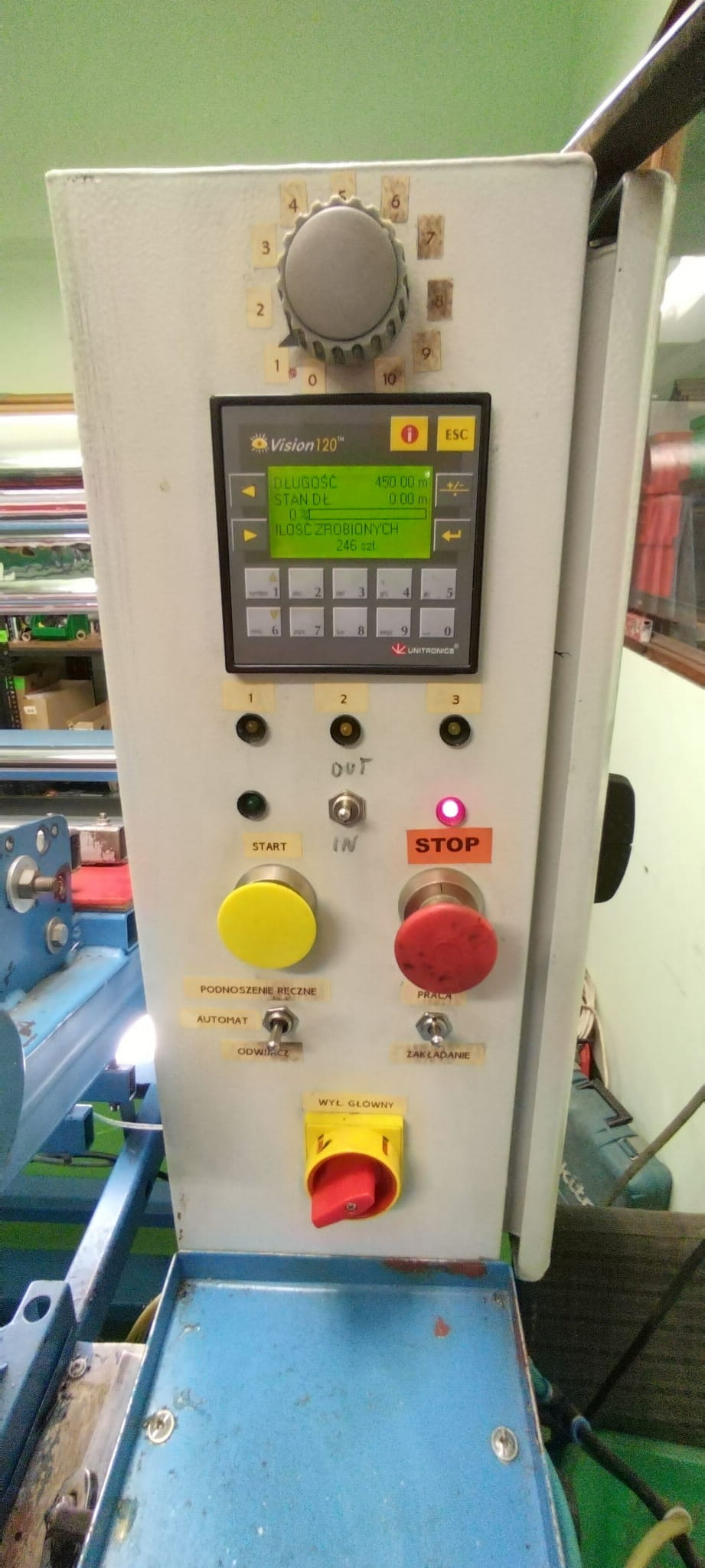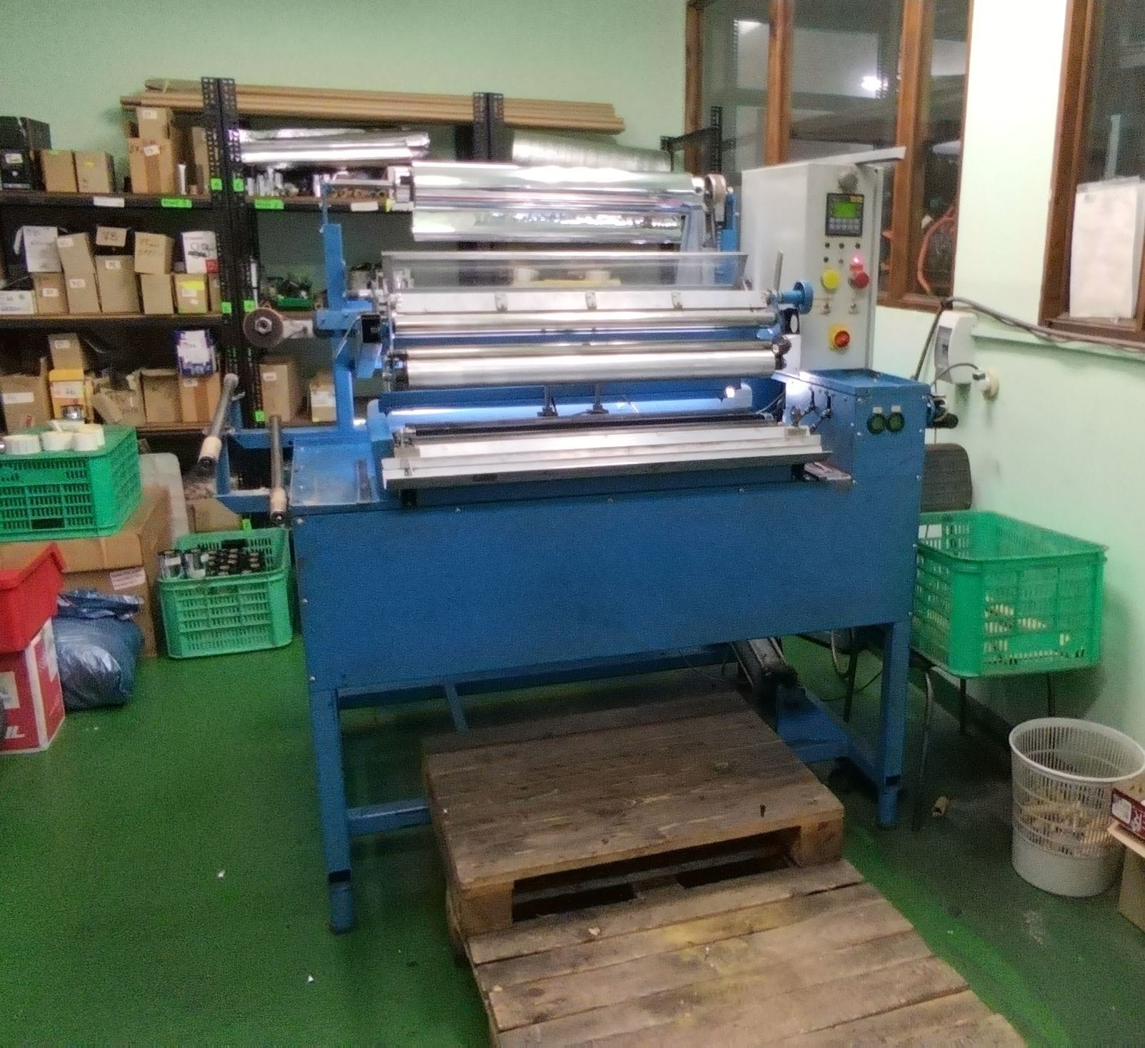 Maszyna służy do przewijania, cięcia wzdłużnego, odmierzania długości folii na rolkach małej średnicy, oraz przyklejania do jej końców odcinków folii metalizowanej. Automatyczny stop po nawinięciu zadanej długości rolki.