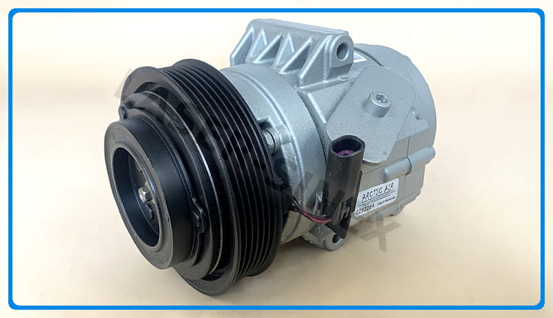 Sprężarka klimatyzacji samochodowej (kompresor) jest jedną z części zamiennych układu chłodzenia w samochodzie. Kompresor układu klimatyzacji napędzana jest za pomocą paska klinowego silnika. Sprężarka odpowiedzialna jest za sprężanie czynnika chłodniczego i przekazywanie go w postaci gazu o wysokiej temperaturze i ciśnieniu do skraplacza - skąd, przez osuszacz trafia do zaworu rozprężnego. Następnie w postaci cieczy o niskim ciśnieniu, transportowany jest do parownika gdzie z pomocą wiatraka dociera do kabiny klimatyzowanego pojazdu. Zadaniem sprężarki układu klimatyzacji jest napędzanie całej klimatyzacji w samochodzie.