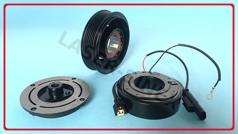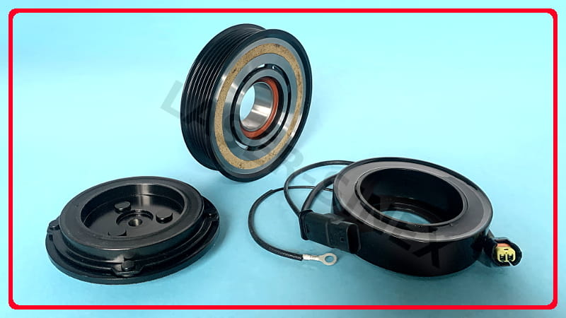 Sprzęgło elektromagnetyczne jest elementem składowym sprężarki klimatyzacji. Kompletny napęd sprężarki składa się z kola pasowego z łącznikiem sprzęgła, zabierak (tarcza sprzęgła) oraz elektromagnes (cewka sprzęgła). Koło sprzęgła napędzane jest paskiem napędowym odchodzącym od silnika samochodu. Sprzęgło sprężarki za pomocą cewki elektromagnetycznej, umieszczonej w kole pasowym sprzęgła, powoduje włączenie i rozłączenie kompresora, we właściwych momentach pracy układu chłodzącego.