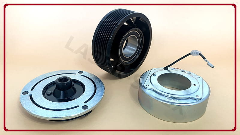 Sprzęgło elektromagnetyczne jest elementem składowym sprężarki klimatyzacji. Kompletny napęd sprężarki składa się z kola pasowego z łącznikiem sprzęgła, zabierak (tarcza sprzęgła) oraz elektromagnes (cewka sprzęgła). Koło sprzęgła napędzane jest paskiem napędowym odchodzącym od silnika samochodu. Sprzęgło sprężarki za pomocą cewki elektromagnetycznej, umieszczonej w kole pasowym sprzęgła, powoduje włączenie i rozłączenie kompresora, we właściwych momentach pracy układu chłodzącego.