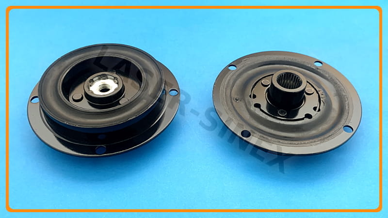 Tarcza sprzęgła do kompresora klimatyzacji jest jednym z elementów wykonawczych sprzęgła elektromagnetycznego. Sercem klimatyzacji samochodowej jest sprężarka, której zadaniem jest przemieszczanie czynnika z części niskiego ciśnienia do części wysokiego ciśnienia. Kompletne sprzęgło składa się z trzech elementów: koła pasowego z łożyskiem, cewki elektromagnetycznej oraz tarczy sprzęgła, zwanej potocznie sprzęgłem lub zabierakiem. Zabierak reaguje na impuls elektromagnesu sprężarki - odpowiedzialny jest za łagodne załączenie napędu sprężarki klimy.